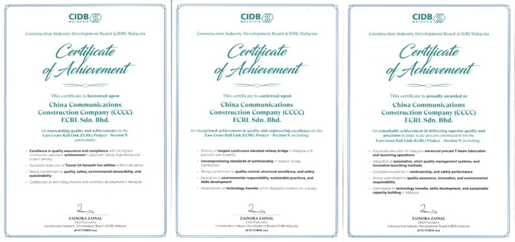 Meanwhile, at the International Construction Transformation Conference (ICTC) 2025 in Kuala Lumpur, the ECRL Section 9 won three construction excellence awards from the Malaysian Construction Industry Development Board (CIDB), making it the highlight of the event.