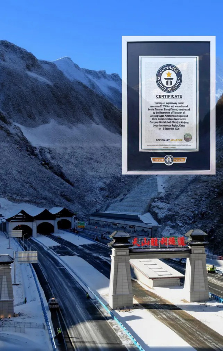 Recently, the Tianshan Shengli Tunnel—the key control project of the Urumqi–Yuli Expressway invested, built, and operated by CCCC—was certified by Guinness World Records as the the world's longest expressway tunnel, with a single-bore length of 22.13 kilometers. The accolade highlights CCCC's leading-edge technology and engineering prowess in constructing ultra-long tunnels under high-altitude, cold-region, and highly complex geological conditions.